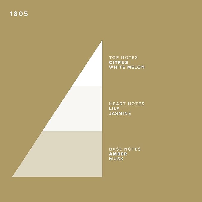 • 1805: A fresh oceanic fragrance with top notes of Bergamot, Mandarin, and Cardamon, combined with a Lavender, Geranium, and Clary Sage heart resting on a Sandalwood, Cedar Wood, and Musk base