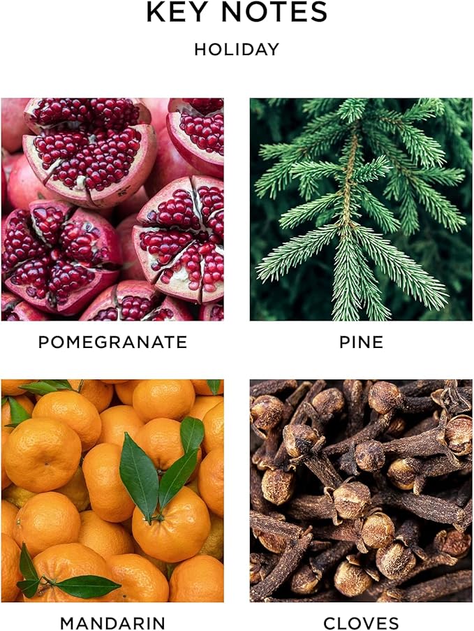 • CITRUS & WOODY - Pomegranate, mandarin orange, pine, cloves, and cinnamon blend with a hint of vanilla and amber in this sophisticated fragrance, instantly providing the aroma of a sparkling holiday season.