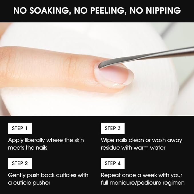 • EASY TO USE: Apply liberally where the skin meets the nails. Using the Cuticle Pusher or an orangewood stick (sold seperately), gently push cuticles back toward the knuckle. Once complete, wipe nails clean with a piece of cotton. Repeat once a week.