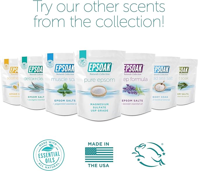• Made with Epsoak Epsom Salt & Minera Dead Sea Salt - Trusted brands of SFSC. Proudly made in the USA. Never tested on animals, Leaping Bunny Certified cruelty free.