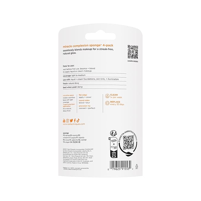 • Value Pack Makeup Sponge Set – Includes 4 Real Techniques Miracle Complexion Sponges designed for effortless, streak-free blending of liquid and cream makeup