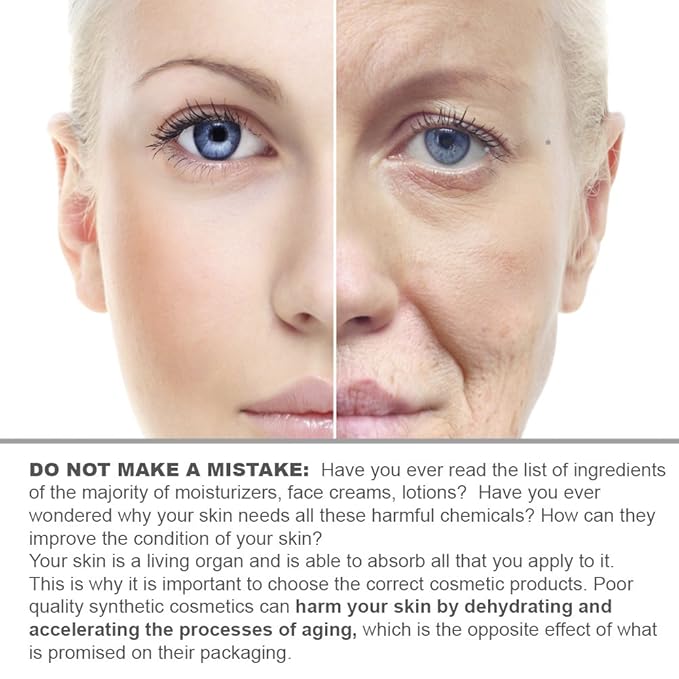 • DO NOT MAKE A MISTAKE: Your skin is able to absorb all that you apply to it. This is why it is very important to choose the correct and safe cosmetic products. Poor quality synthetic cosmetics can harm your skin, dehydrate, accelerate processes of aging. When we were developing our Plant-Based Moisturizer formula - we were thinking about the health of your skin as our first priority.
