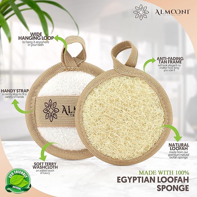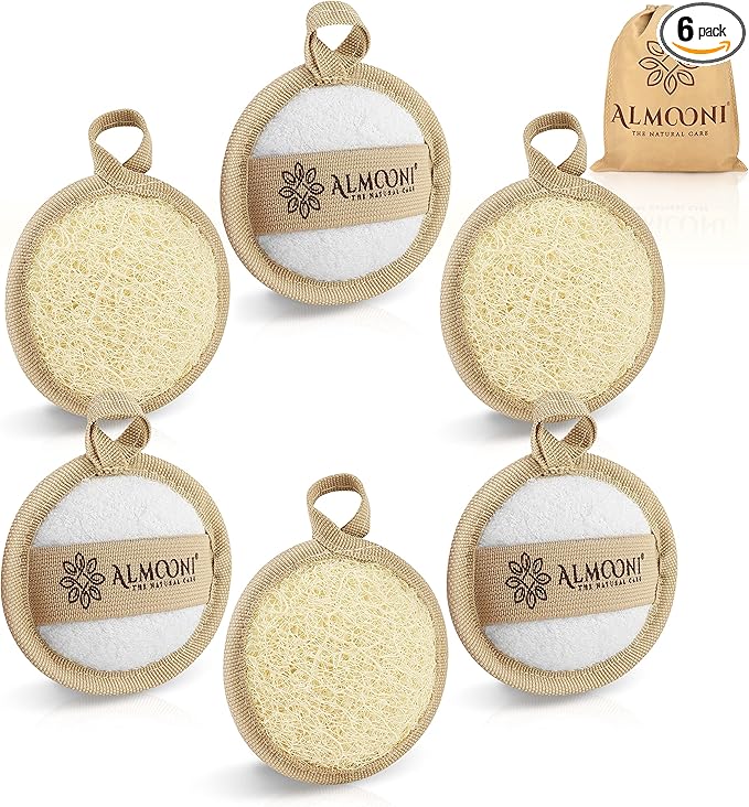 • SHOWER YOUR WAY to healthier-looking facial skin with face loofah pads by ALMOONI. Lightly textured natural loofah sponge exfoliating face scrubber sweeps away dead cells to give you a more radiant appearance.