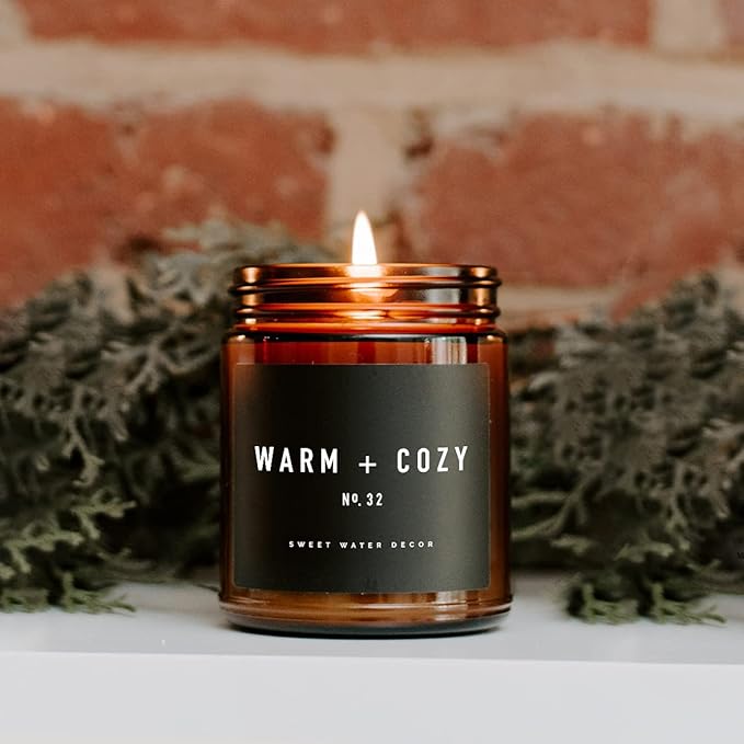 Sweet Water Decor Warm and Cozy Candle | Pine, Orange, Cinnamon, and Fir Balsam Winter Scented Soy Candles for Home | 9oz Amber Jar with Black Lid, 40 Hour Burn Time, Made in The USA
