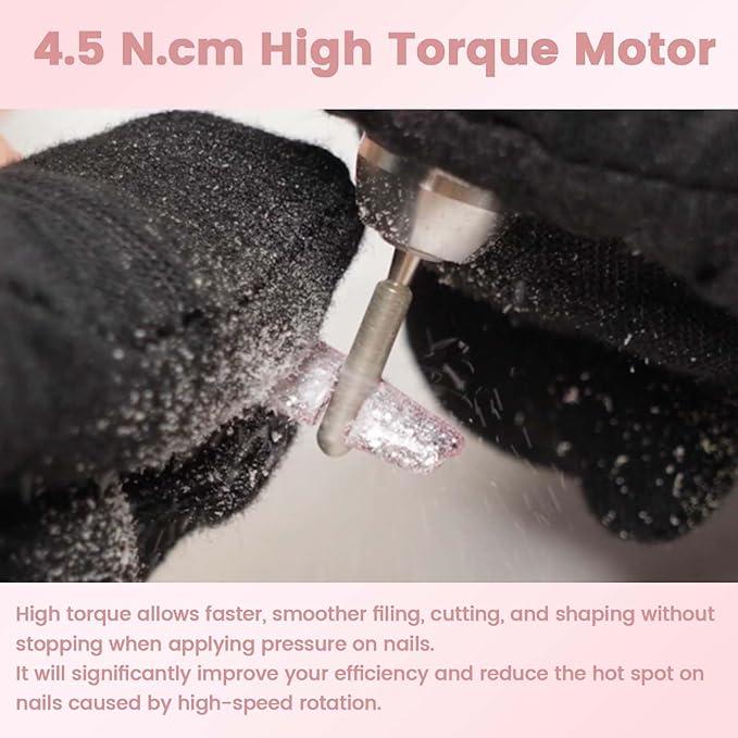 • Exclusive High-Torque Motor: The industry-leading 0.46 kgf.cm (4.5 n.cm) high torque motor enables the Delanie e-file nail drill to smoothly file off any nail products and shape any artificial nails without stopping on nails. 0.34 kgf.cm measured on the nail drill bit