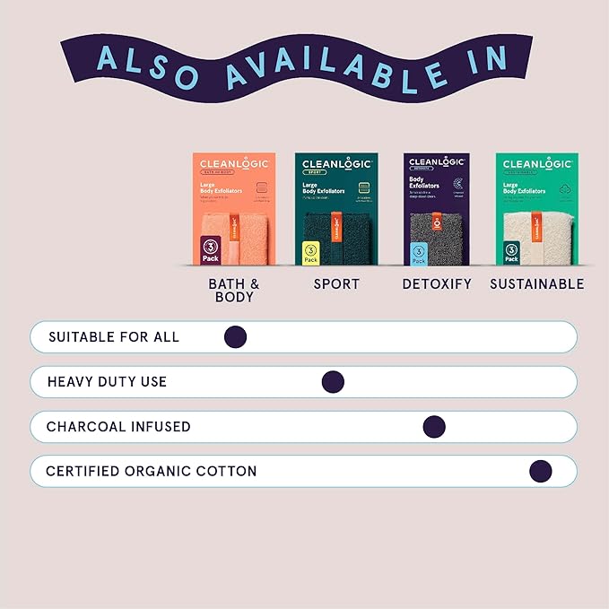 Cleanlogic Detoxify Purifying Charcoal Infused Exfoliating Body Scrubber, Reusable Exfoliator Tool for Smooth and Softer Skin, Daily Skincare Routine, 3 Count Value Pack