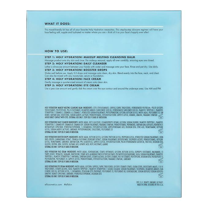 • A COMPLETE HYDRATION REGIMEN: This skincare kit has all of your favorite Holy Hydration necessities- a Holy Hydration. Daily Cleanser, Holy Hydration. Makeup Melting Cleansing Balm, Hydrating Booster Drops, Holy Hydration. Face Cream and Eye Cream.