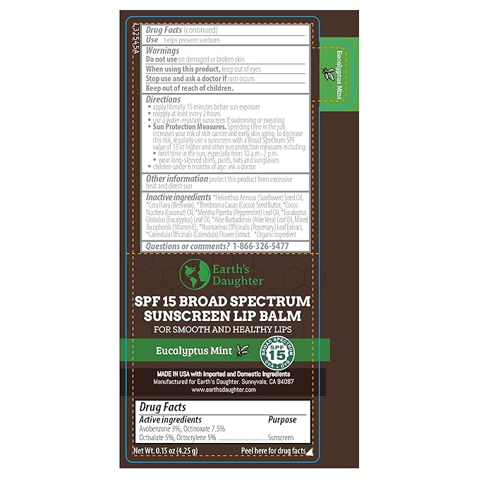 • BROAD SPECTRUM SUN PROTECTION – With SPF 15 (sun protection factor), our Earth’s Daughter SPF lip balm protects against both UVA and UVB rays. This broad spectrum protection combined with our premium organic moisturizing ingredients provides the ultimate all season chapped lip stick.