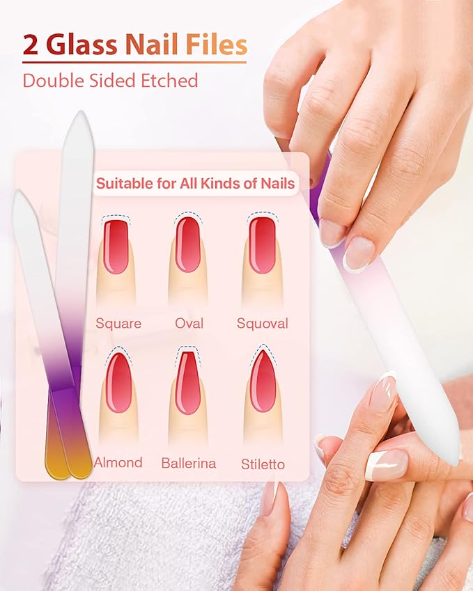 • 【Ideal Nail Manicure Tool】: 2PC tempered glass nail buffer files and 2PC nano glass nail shiners, not only shape nails, but also polish natural nails. Perfect for all types of nails: fingernails, toenails, acrylic nails and natural nails. Suitable for home DIY and salon.