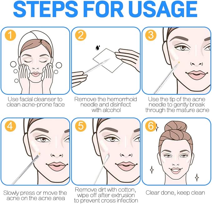 • Precautions Before Starting: please wipe all tools with rubbing alcohol before and after each use including the tool, your hands, and pimple area