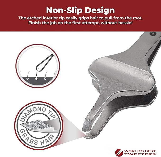 • ERGONOMIC WIDE GRIP DESIGN: The World's Best Tweezers Diamond Line Butterfly Tweezers feature a unique wide grip butterfly shape, offering enhanced control and ease of use. This slant tip design provides unparalleled precision for eyebrow shaping, facial hair removal, and ingrown hair extraction, making it a versatile tool for both men and women.