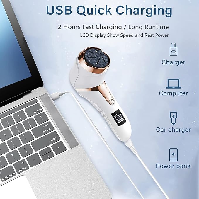 • Rechargeable, Long-Lasting, Easy to Use ----Included USB charging cable, This electric foot file can be charged via any USB port, and have a long runtime 2hours after full charged .and this dead skin remover for feet have LCD Power display let you clear know the rest power it left. remind you charge in time