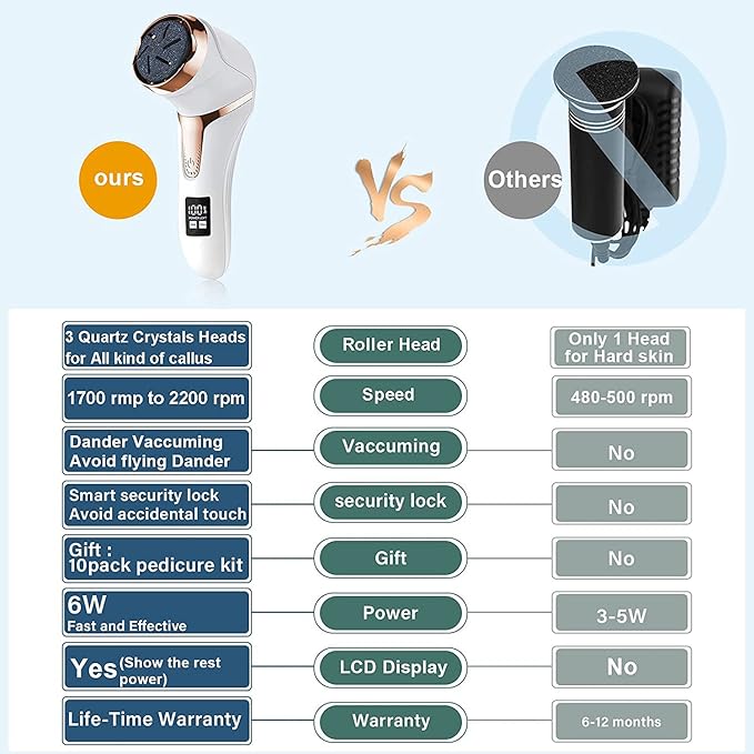 • Pedicure kit with 3 Grinding Head, 2 Speed, with VACUUM ABSORPTION----- 3 Quartz Crystals Removable Roller Heads and 2 Speed Correspond to the roughness required to remove the calluses on the feet. UPGRADE powerful callus remover with dander vacuum cleaner quickly sucks away foot scraps, cle.an and hygienic, and sucks while grinding. dust-free, and foot scraps will not be scattered in air or floor, an essential home pedicure kit for people who has cleanliness.