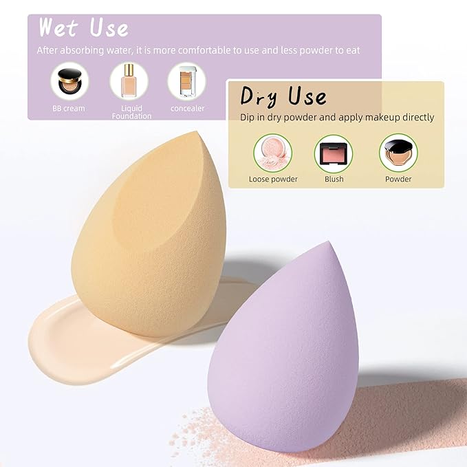 WET USE & DRY USE: blending sponge will turn bigger when wet, the sponges expand and become softer so that the cosmetics stay on top of them rather than being absorbed. Dab it gently in the makeup and bounce it along your skin for a natural, flawless look. Minimal absorption with maximum coverage and made to last!