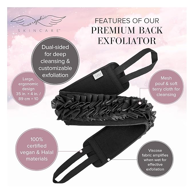 Seraphic Skincare Premium Back Exfoliator – Dual-Sided Back Scrubber for Men & Women – 100% Vegan – Viscose Side for Deep Exfoliation, Mesh & Washcloth Side for Cleansing – Bacne Prevention