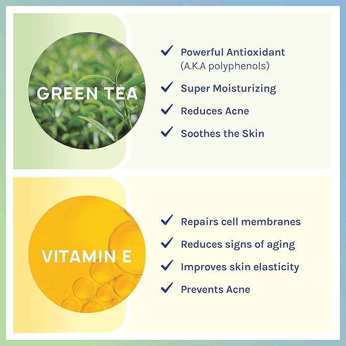 • Green Tea & Vitamin E: Infused with green tea and vitamin E to soothe and brighten skin.
