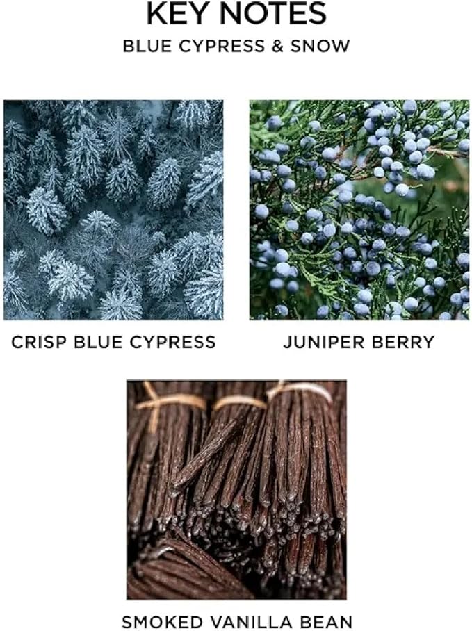 • EARTHY & WOODY - Crisp blue cypress, juniper berry, and hints of smoked vanilla bean combine in this sophisticated fragrance, recreating the aroma of a snow-covered winter mountain retreat in your home.