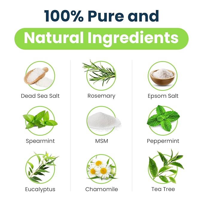 • 100% NATURAL TEA TREE FOOT SOAK FOR HEALTHY FEET: Using nothing but the finest natural and organic ingredients, this foot soak is rich in Epsom salts, Pure DeadSea salts, tea tree oil, eucalyptus, peppermint, cajuput, camphor, rosemary, lavender, and other essential oils. Their powerful combined action is the perfect way to fight away foot conditions, soften your calluses, moisturize your cracked heels and pamper your tired and sore feet whenever you feel like it!