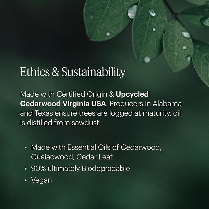 • Eco-Friendly & Sustainable – Made with Certified Origin & Upcycled Cedarwood from Virginia, USA, this fragrance is as good for the planet as it is for your home. With 90% ultimate biodegradability, you can enjoy a “clean, fresh, perfect” scent while making a responsible choice.