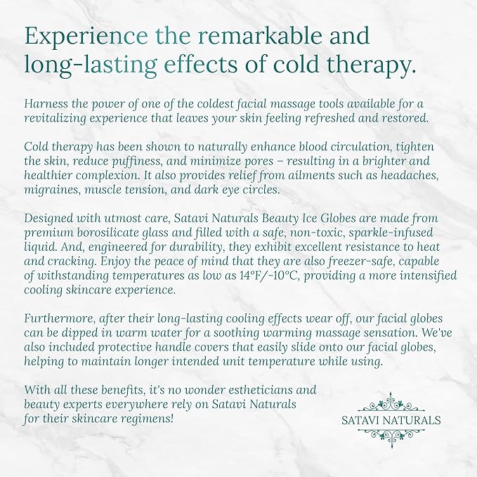• Soothing Facial Treatment: Experience the ultimate rejuvenation for your skin with Satavi Naturals' exquisite Beauty Ice Globes. Part of our Home Spa Collection, these professional-grade esthetician facial tools offer a spa-like experience in the comfort of your own home.