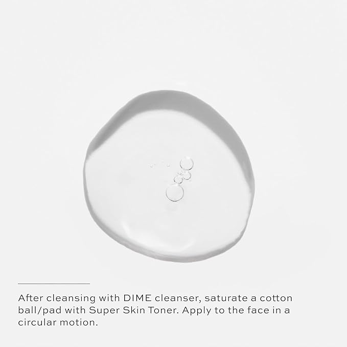 • SUGGESTED USE: After cleansing with your favorite DIME cleanser, saturate a cotton ball or cotton pad with Super Skin Toner. Apply to the face in a circular motion. Avoid the eye area. For best results, follow with the application of a DIME serum and moisturizer.