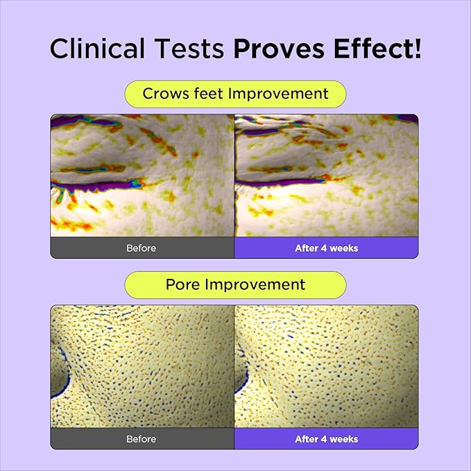 • 📊 NOTICEABLE RESULTS: ✅Immediate effect on quantity, size, volume, and depth of the skin pore with one-time use ✅ Improvement on skin moisturizing, eye wrinkle, skin elasticity, face lift (cheek), skin density and skin texture (roughness) with 4 weeks use 💛FLUORESCENT YELLOW COLOR IS THE NATURAL COLOR OF RETINAL 💛