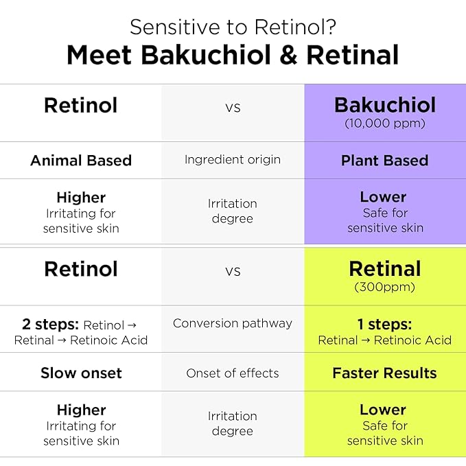• 🌙NEXT-GEN RETINOL: Formulated with two next-gen retinol alternatives, Bakuchiol (1%) and Retinal (0.03%). Retinal is the perfect alternative to the irritation of Retinol with a higher activity level. Bakuchiol is a plant-based retinol alternative with fewer side effects and is safer to be used for all skin types, making it easy for beginners. Formulated alongside with Hyaluronic Acid and ceramide, it works during your sleep so you can wake up to a visibly smoother, bouncier skin.