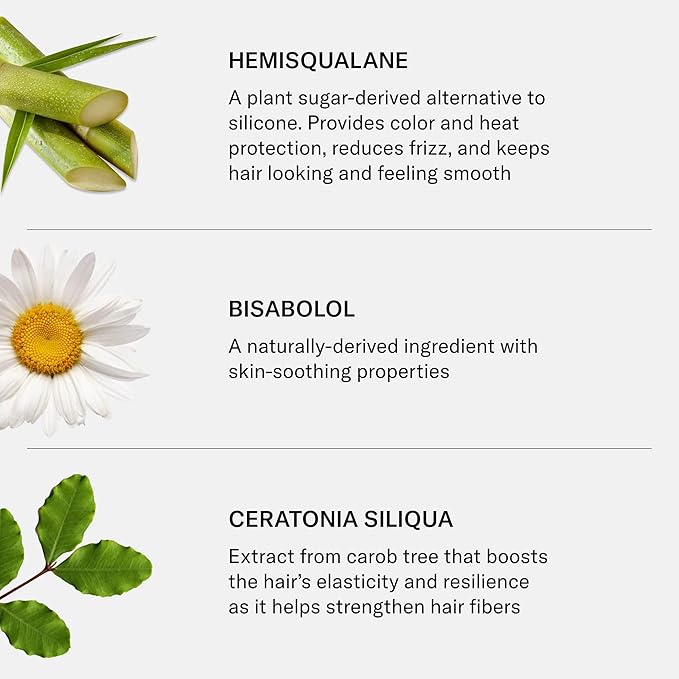 Hero Ingredients: Hemisqualane – a plant sugar-derived alternative to silicone that provides color and heat protection, reduces frizz, and leaves hair smooth. Bisabolol – a naturally derived ingredient with skin-soothing benefits. Ceratonia Siliqua – carob tree extract that boosts elasticity and strengthens hair fibers. Moringa Oleifera – horseradish tree extract that shields hair from pollution and UV rays. Squalane – a plant-derived moisturizer that nourishes, restores luster, and adds shine.