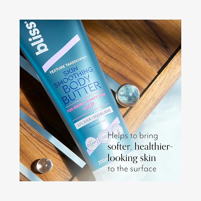 • TEXTURE TAKEDOWN SKIN SMOOTHING BODY BUTTER: Bliss' unscented body lotion helps to reduce the look of rough and bumpy skin, even stubborn Keratosis Pilaris (KP) on arms and legs.