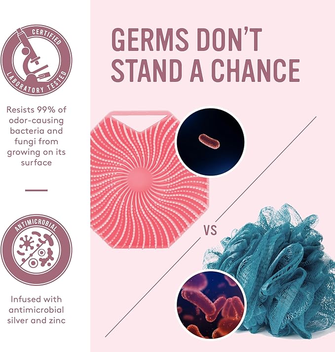 Sud Scrub® Antimicrobial Silicone Body Scrubber, Exfoliating Body Scrubber for Sensitive Skin, Eco Friendly Shower Scrubber for Body, Silicone Body Brush for Showering, Pink