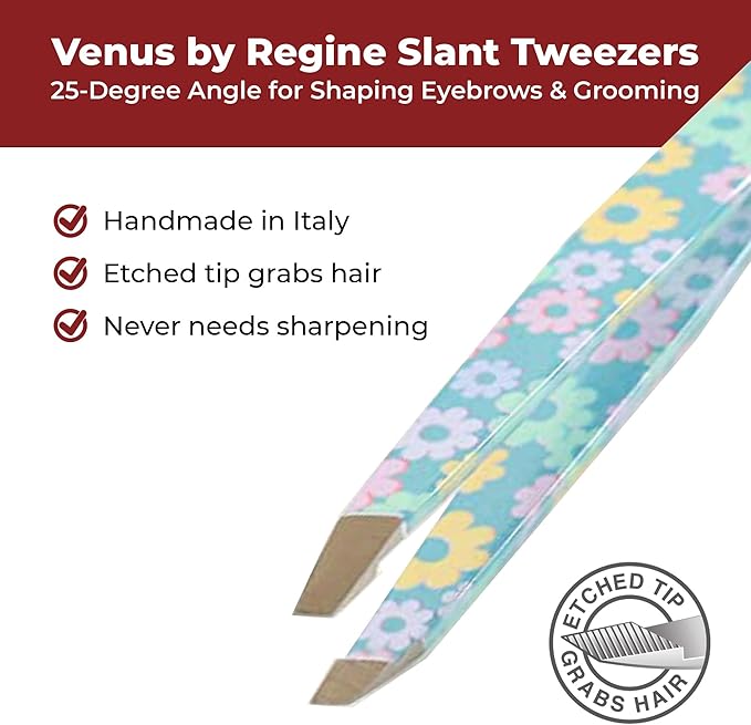 Venus by Regine Slant Tweezers - Handmade Precision Tool for Women & Men, 25-Degree Angle for Shaping Eyebrows & Grooming Facial Contours, Suitable for Eyebrow & Facial Hair Removal (Small Flowers)