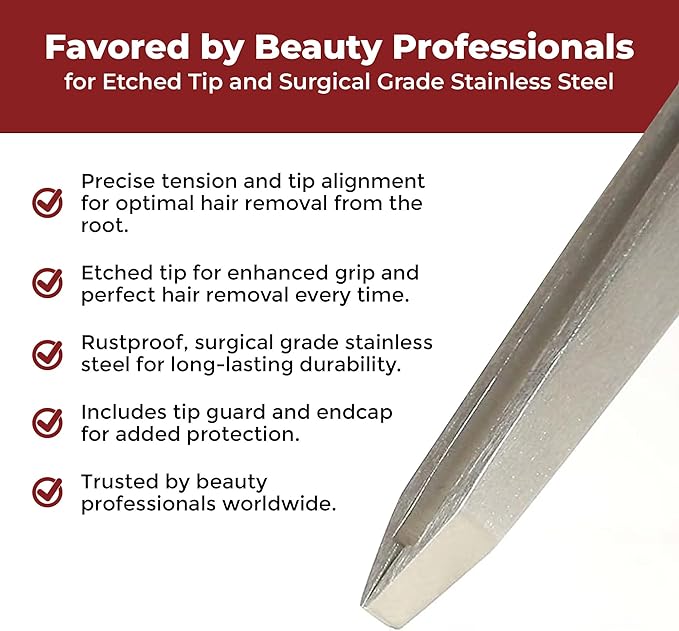 • PRECISION TENSION AND TIP ALIGNMENT: The interior of the tip is etched to easily grip and pull the hair from the root every time, and is favored by beauty professionals worldwide. For the best results, always use tweezers on clean skin without any lotions, oils, or makeup.