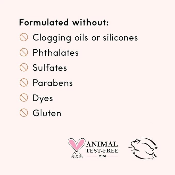 • Formulated Without: Sulfates, silicones, phthalates, parabens, dyes, pore-clogging oils, formaldehyde-releasing preservatives, or gluten. Vegan. Cruelty-Free.