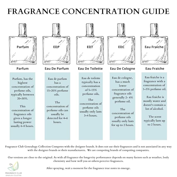 • Disclaimer: Fragrance Club Genealogy Collection competes with the designer brands. It does not use their fragrances and is not associated in any way with the designer brands or their manufacturers. We are competing brands of competing companies