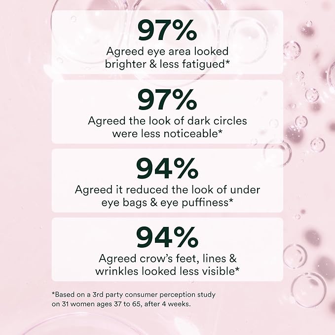 • Brighten and Revitalize: Our unique seaweed blend of Undaria and red algae brightens the delicate skin under the eyes, erasing signs of fatigue by minimizing crow’s feet and under-eye bags. Our plant extract blend works to improve the appearance of dark circles, while peptides smooth fine lines and wrinkles. Clinically tested quinoa extract further reduces under-eye puffiness, and Hyaluronic Acid provides essential hydration.