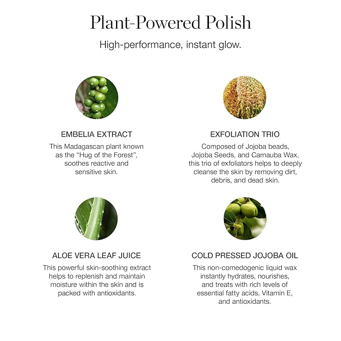 • Polished Perfection: This high-performance, plant-based polish effectively cleanses the skin, leaving a visibly soft, smooth complexion, creating the perfect canvas to follow through with skincare and beauty.