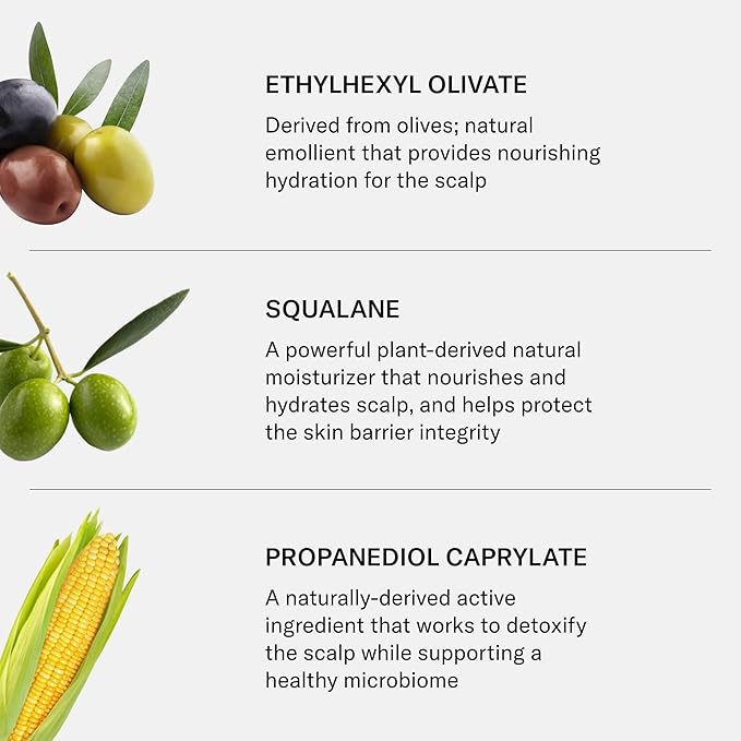 Hero Ingredients: Ethylhexyl Olivate: Derived from olives; natural emollient that provides nourishing hydration for the scalp. Squalane: A powerful plant-derived natural moisturizer that nourishes and hydrates scalp, and helps protect the skin barrier integrity. Propanediol Caprylate: A naturally-derived active ingredient that works to detoxify the scalp while supporting a healthy microbiome. Sarcosine: Helps to rebalance the microbiome and fights against stress, pollution, and product buildup