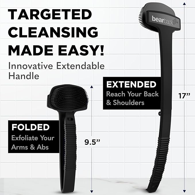 • Adjustable Reach, Compact Control: The folding handle extends to 17” for back and lower-body reach, then collapses to 9.5” for precise scrubbing on arms, neck, or torso. It’s perfect for travel, storage, and daily use.
