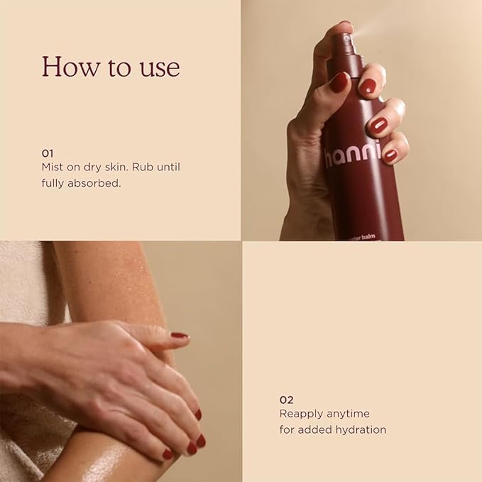 • BODY MIST: Water balm is a weightless body mist that replaces your body lotion but feels as light as water on skin, leaving no residue left behind. Pro-tip: if you're going hair-free, pair with the hanni weighted razor for the smoothest, softest skin.