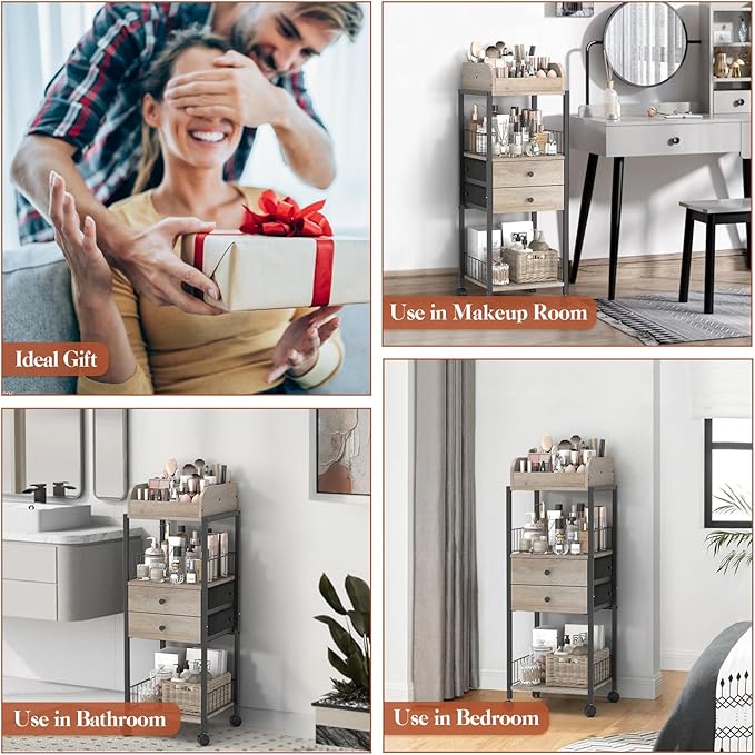 • 【Newest Floor Makeup Organizer】This makeup organizer with open spaces and storage drawers is designed to keep the skin care products, cosmetics, makeup accessories, hair tools, bags organized. It can be fixed beside bathroom vanity and bedroom dresser. The sleek and modern finish is an easy fit for home organization.