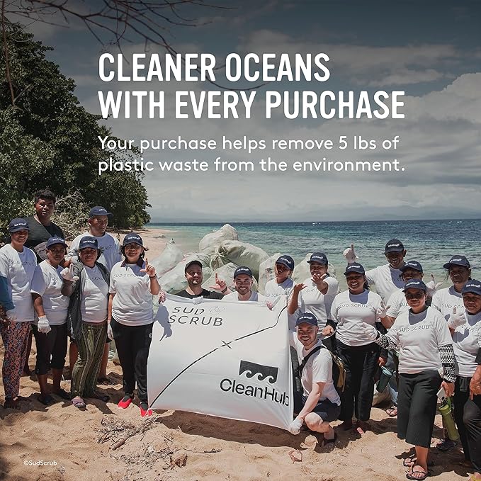 • ECO-FRIENDLY - This antimicrobial body scrubber is 100% plastic-free and recyclable. For every Sud Scrub you purchase, 5 lbs of plastic waste are collected and removed from the environment.