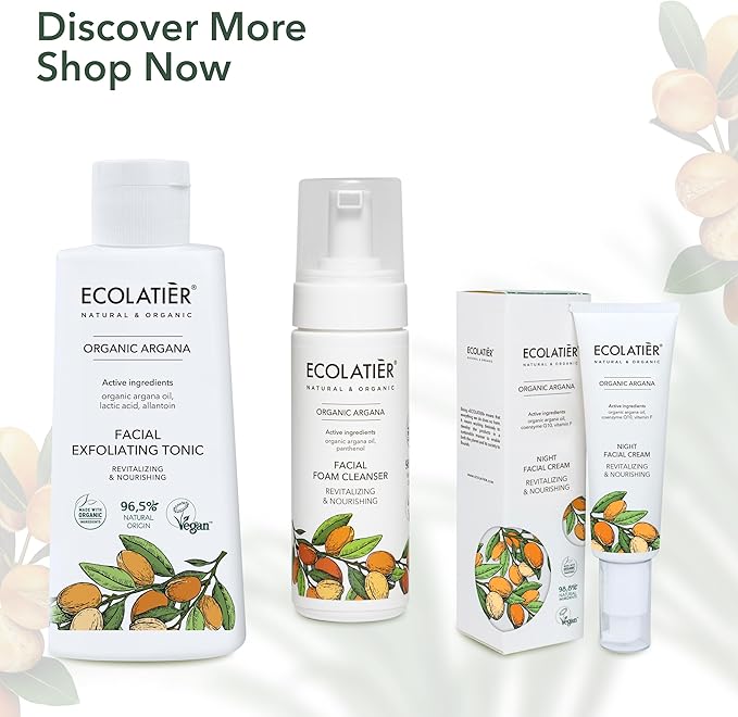 Exfoliating facial toner with Organic Argana Oil, rich in vitamins A and E, omega-6, and antioxidants, promoting elasticity and reducing fine lines for smooth, hydrated skin.