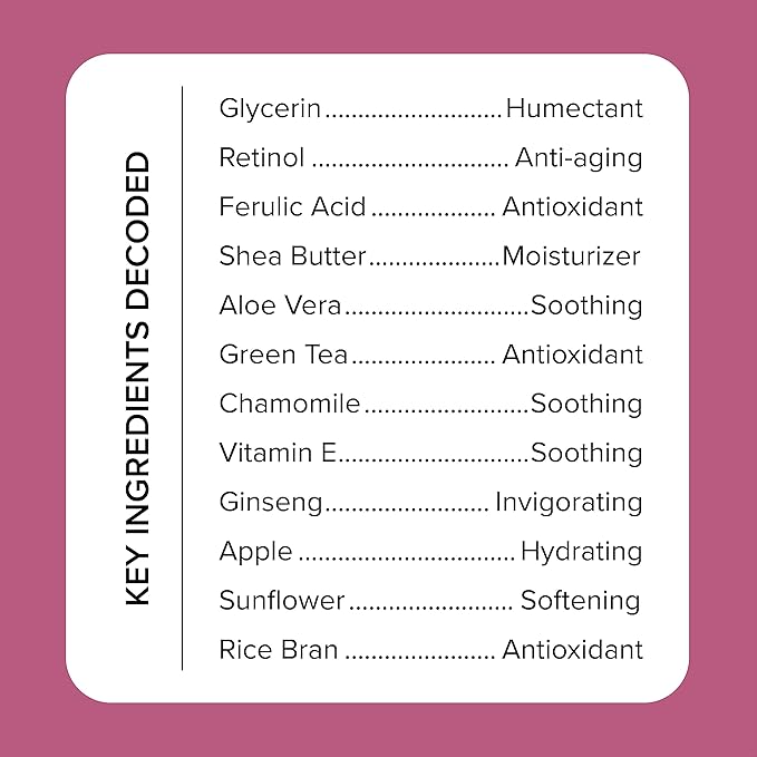 • RELAX & RESTORE – Non-Greasy Formula, Vegan, Cruelty-Free. Free From: Parabens, Drying Alcohols, Animal-Derived Ingredients, PEGs, Sulfates, Dyes, Talc, & Mineral Oil. Manufactured in our cGMP & MoCRA compliant facility in Chicago, USA. RETINOL BEGINNERS, please take care to test cream on a small area of skin, gradually phasing into your skincare routine, working up to twice daily as tolerated. If irritation occurs, reduce frequency. If irritation persists, discontinue use.