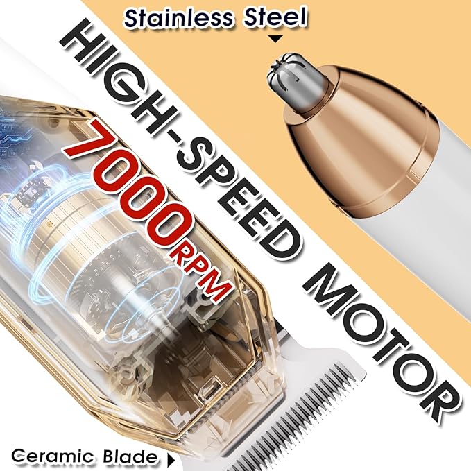 • Women's Hair Removal Kit: This premium hair trimmer set includes a bikini trimmer and four interchangeable heads (for nose hair, eyebrows, body hair, and an electric hair clipper). It comes with a cleaning brush, a velvet bag, a USB charging cable, and three guard attachments for different hair lengths (1-3mm).
