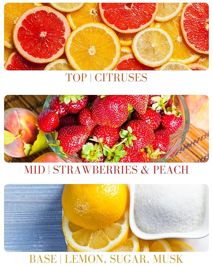 • SCENT PROFILE - Top: Citruses Mid: Strawberries, Peach, Base: Lemon, Sugar, Musk. Delicious fresh strawberries and peach lemon sprinkled with citrus sugar and just a waft of musk.