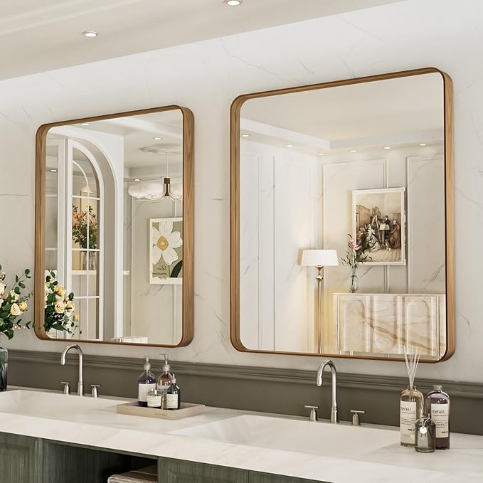 • 【Sturdy Mirror with Premium Materials】: LOAAO wood grain colored bathroom mirror with aluminum alloy frame which is anti-rust; Also the metal-framed mirror built with explosion-proof membrane which ensure the mirror being safely and securely for using
