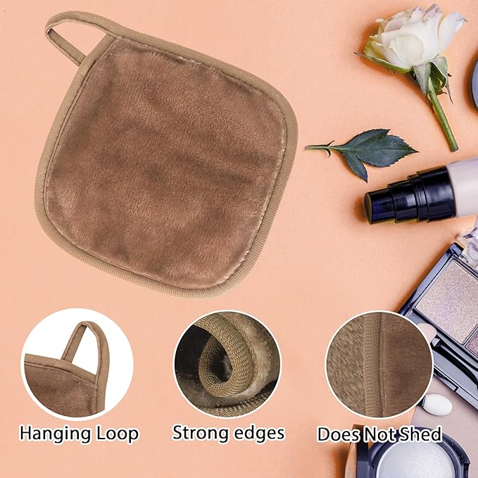 Makeup Remover Cloth, 6" x 6" Make Up Towels Reusable Face Cloth for Washing Face, Makeup Remover Pads Microfiber Face Washcloth with Mesh Bag, Just Water, 12 Pack, Light Brown