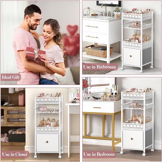 • 【Aesthetic and Functional Makeup Organizer】The latest vanity organizer with stylish flower-patterned fences makes it stand out among other rolling makeup cart. The makeup drawer organizer can store a hodgepodge of products from tall bottles to short jars, including skin care products, cosmetics, beauty accessories, hair tools and more stuff.