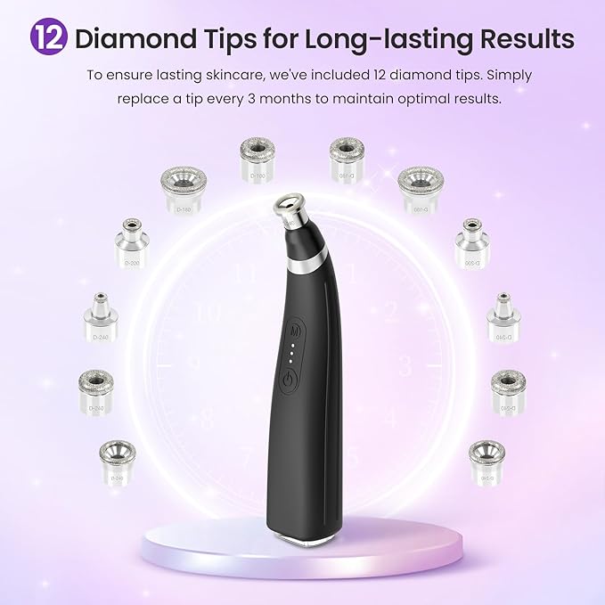 • ๐Ÿญ๐Ÿฎ ๐——๐—ถ๐—ฎ๐—บ๐—ผ๐—ป๐—ฑ ๐—ง๐—ถ๐—ฝ๐˜€: This at home microdermabrasion kit has 12 diamond tips, each meticulously crafted to address multiple skin problems. After using dermabrasion, your skin may appear slightly redness. We recommend that you moisturize your skin with a toner or cream and the redness will disappear about 1 hour.