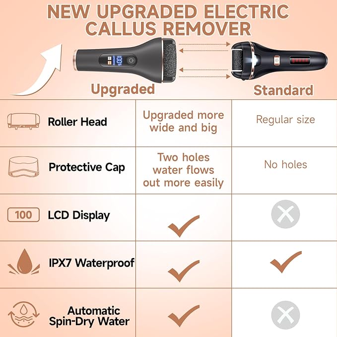 • ✅ 180min Runtime & LED Guidance:Charge via USB-C in 1.5hrs → 3hrs cordless use. Power Level Indicator + spotlight reveals calluses in dark crevices.